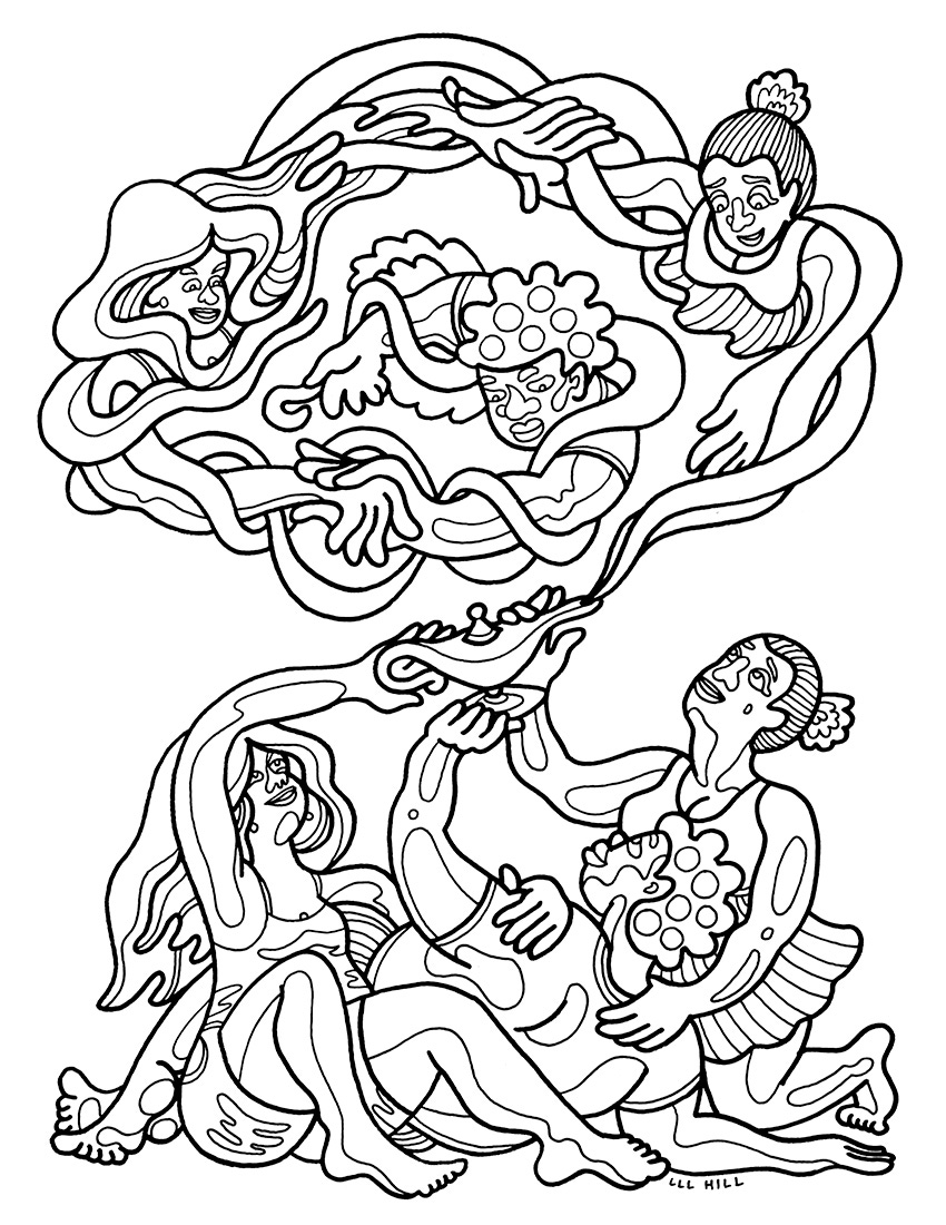 While in many ways, we live far from this reality, it is also true that many of us (more every day) are living by these means, towards these ends, already. We are the ones we have been waiting for, as June Jordan declared to the United Nations in 1978. Drawing this coloring book page, I imagined the joy in setting our own spirits free, and the wishes we might grant ourselves, once unshackled. Notably: we is plural.